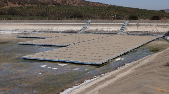 そういう厳しい環境下で、化石燃料由来の電力使用削減という大命題が突きつけられた。コノスルの解決策は、点滴潅水の絶対量を削減するとともに、ソーラーパネルを設置して太陽光エネルギーをポンプとパイプの動力に充てることだった。井戸から汲み上げた地下水はいったん貯水池に溜める。これで地下水のむだ使いを省く。さらにその貯水池の水面上にソーラーパネルを浮かべて太陽光エネルギーを確保するのがコノスル自慢の仕組みだ。これで、貯水池の水面上に設置されたパネルは、太陽光を捕まえて電気に換えるだけでなく、貯水池の水分の蒸発を防ぐ役割も果たしてくれる。まさに一石二鳥である。