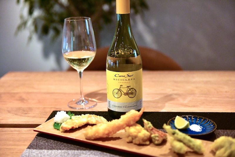 天ぷらは野菜や魚介が具材の中心であり、シャルドネの爽やかな酸味が天ぷらの油分を上手にリフレッシュしてくれます。