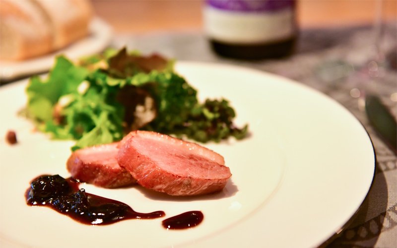 こちらのワインには、濃厚なソースのお料理よりも、比較的シンプルに味付けされたものの方が、このワインの持つフレッシュな味わいとエレガントさを楽しむことができます。そこで、「鴨のロースト ベリーソース」を合わせてみました。塩・胡椒した鴨肉を、皮目を下にしてローストし、クランベリーやチェリーなどの赤系果実のジャムとバルサミコ酢と赤ワイン、そして隠し味に醤油を加えてさっと煮詰めたソースを添えました。付け合わせにグリーンのお野菜を添えれば、この季節にピッタリなクリスマスカラーの一皿が出来上がります。